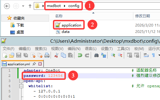 寻找机器人安装的文件夹, 使用 notepad++ 打开 application.yml 文件